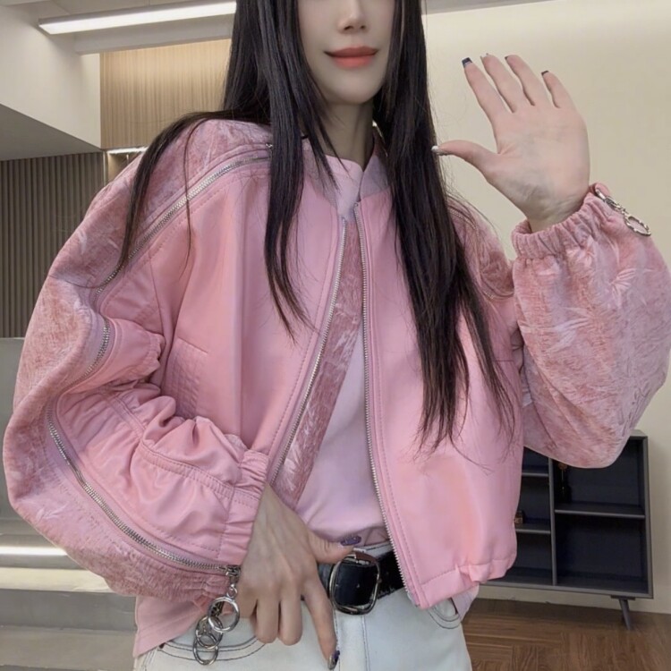 夕蒙2025新款秋韩系气质上衣流行高级感酷炫风小个子粉色皮衣外套