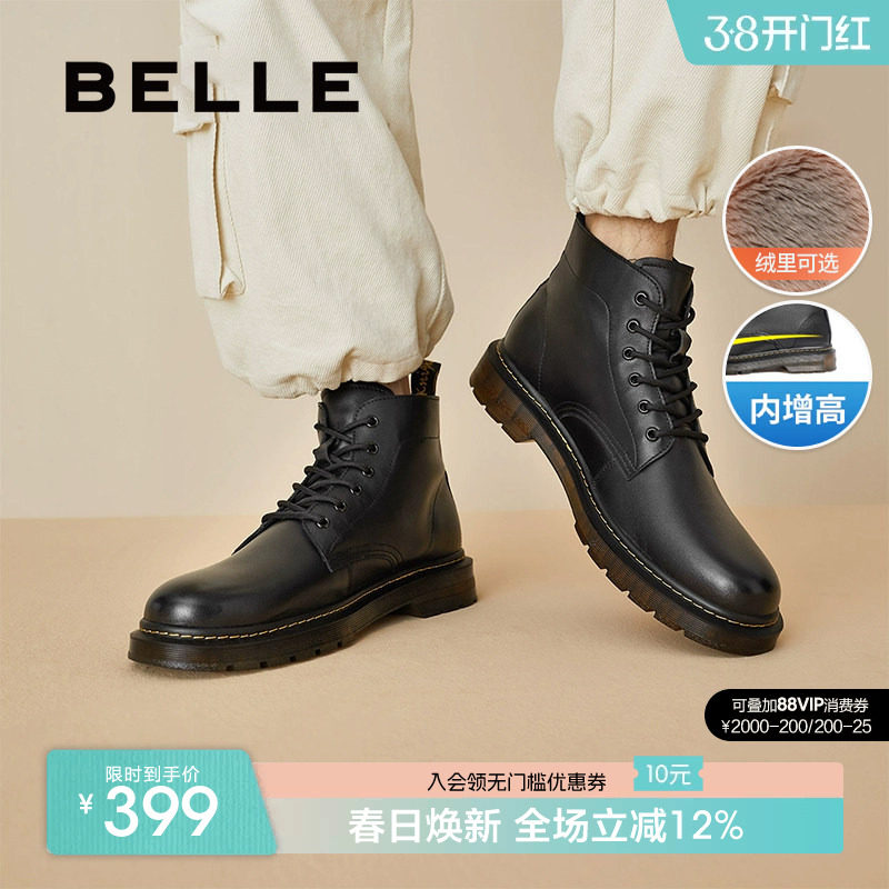 百丽男鞋冬季款真皮马丁靴男厚底增高黑色加绒保暖短靴子92267DD0