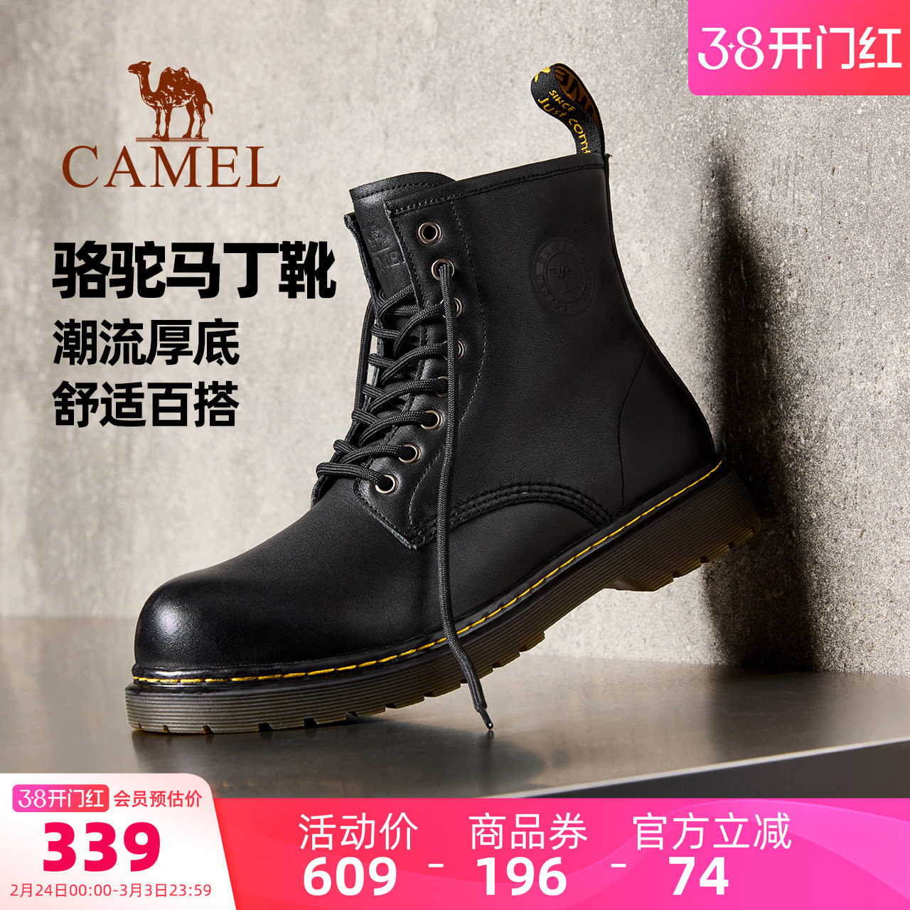 骆驼男鞋2026春季新款牛皮英伦潮流靴子百搭厚底复古黑色马丁靴男
