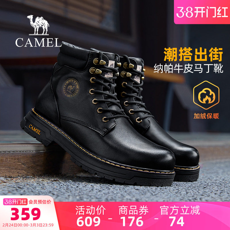 骆驼男鞋春秋季马丁靴英伦风高帮真皮中帮复古工装靴黑色男款靴子