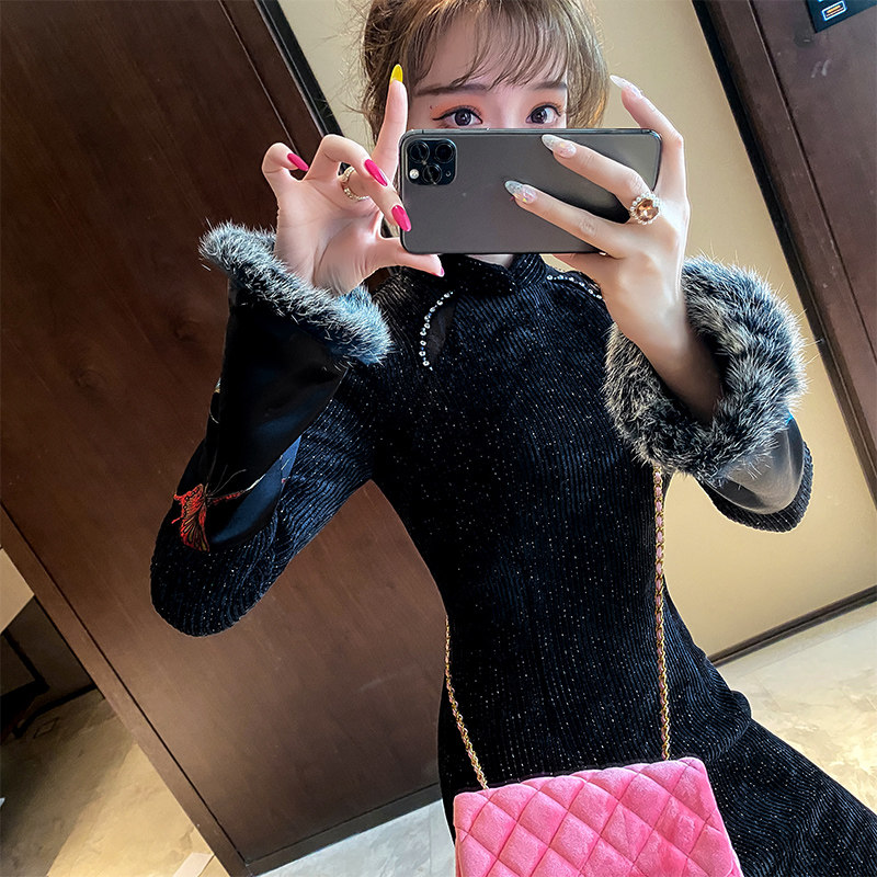 改良中式旗袍2025新款秋冬加厚毛领年轻款少女气质显瘦长袖连衣裙