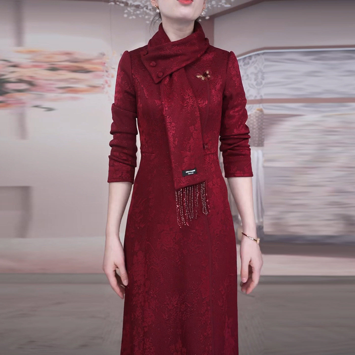 改良旗袍连衣裙2024新款女秋冬加厚高端修身喜婆婆婚宴装妈妈礼服