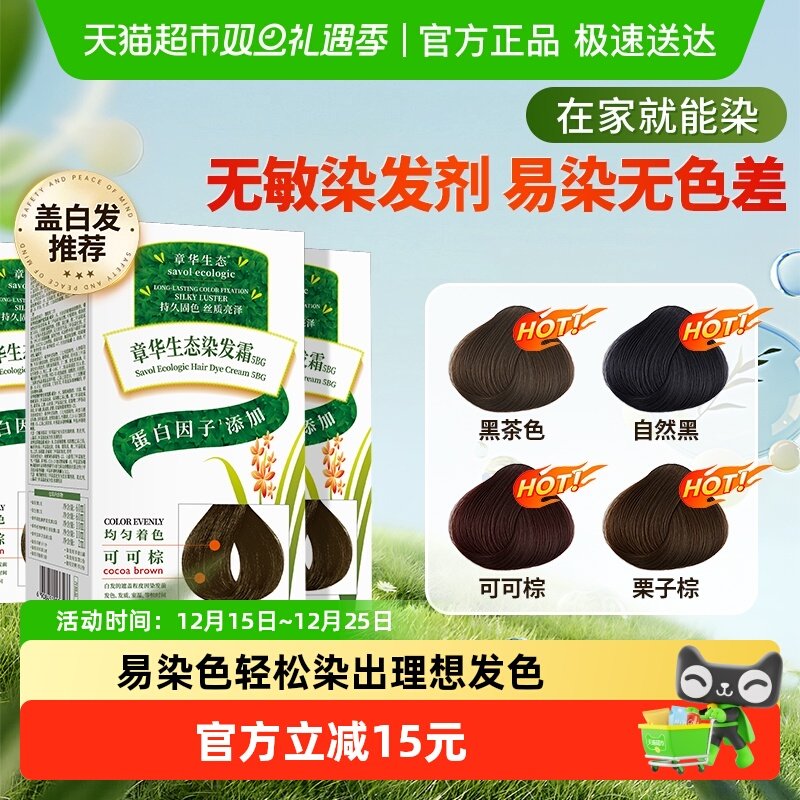 2盒)章华生态染发膏男女染发剂植物天然纯黑茶色遮白头发官方正品