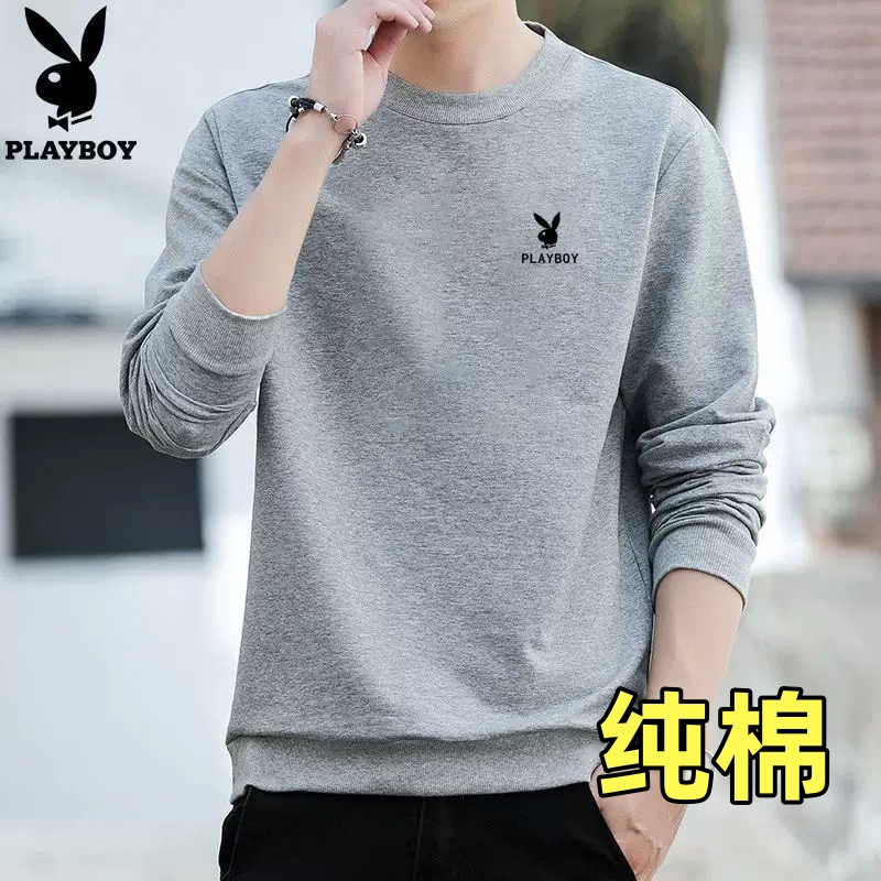 花花公子100%亲肤男士圆领长袖t恤宽松休闲大码秋衣男百搭打底衫