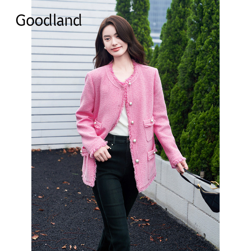 Goodland美地女装春季千金风粉色流苏小香风花纱圆领外套