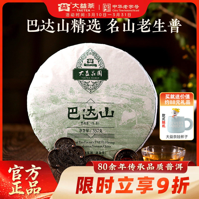 大益普洱茶叶巴达山普洱生茶茶叶357g饼茶勐海1601批次官方旗舰店