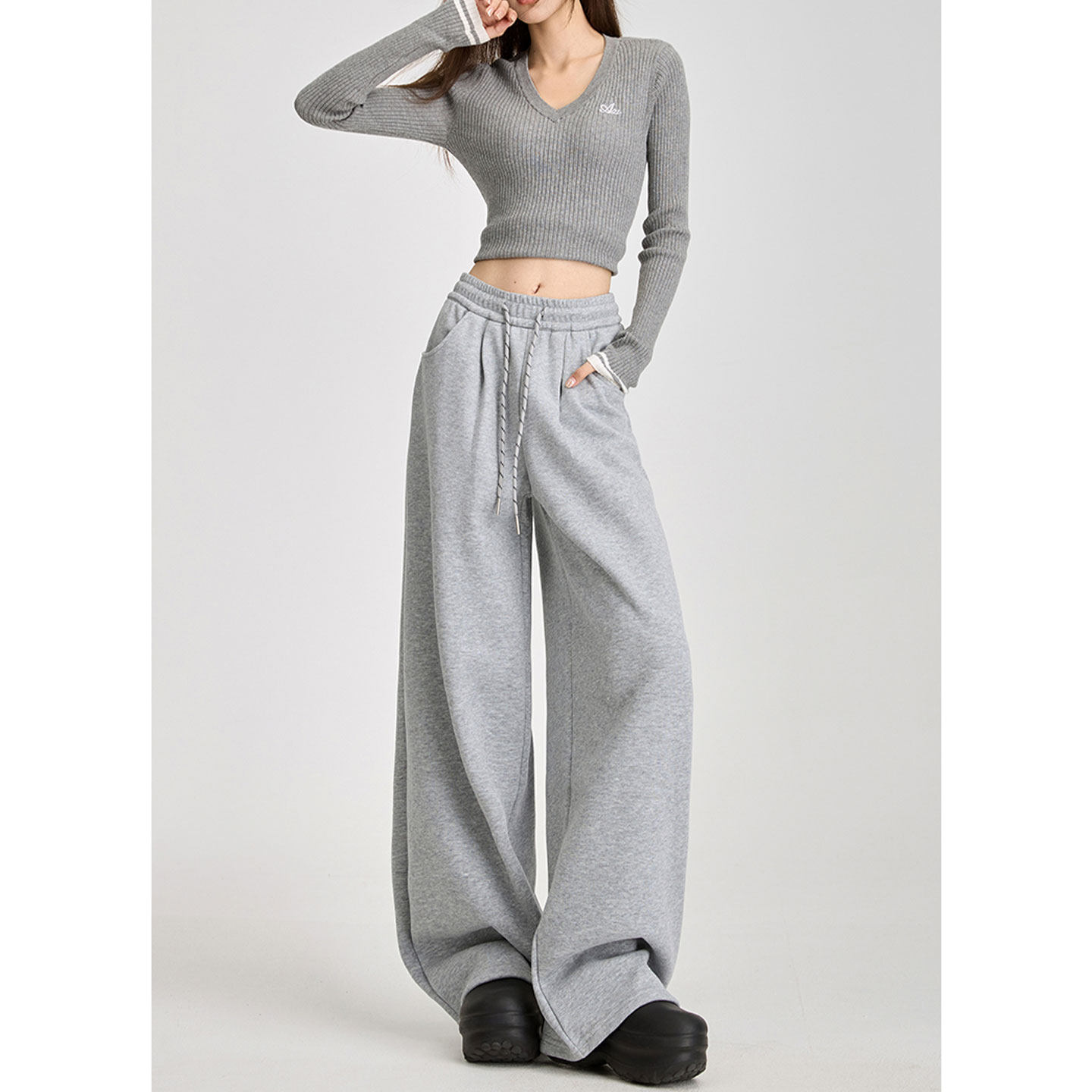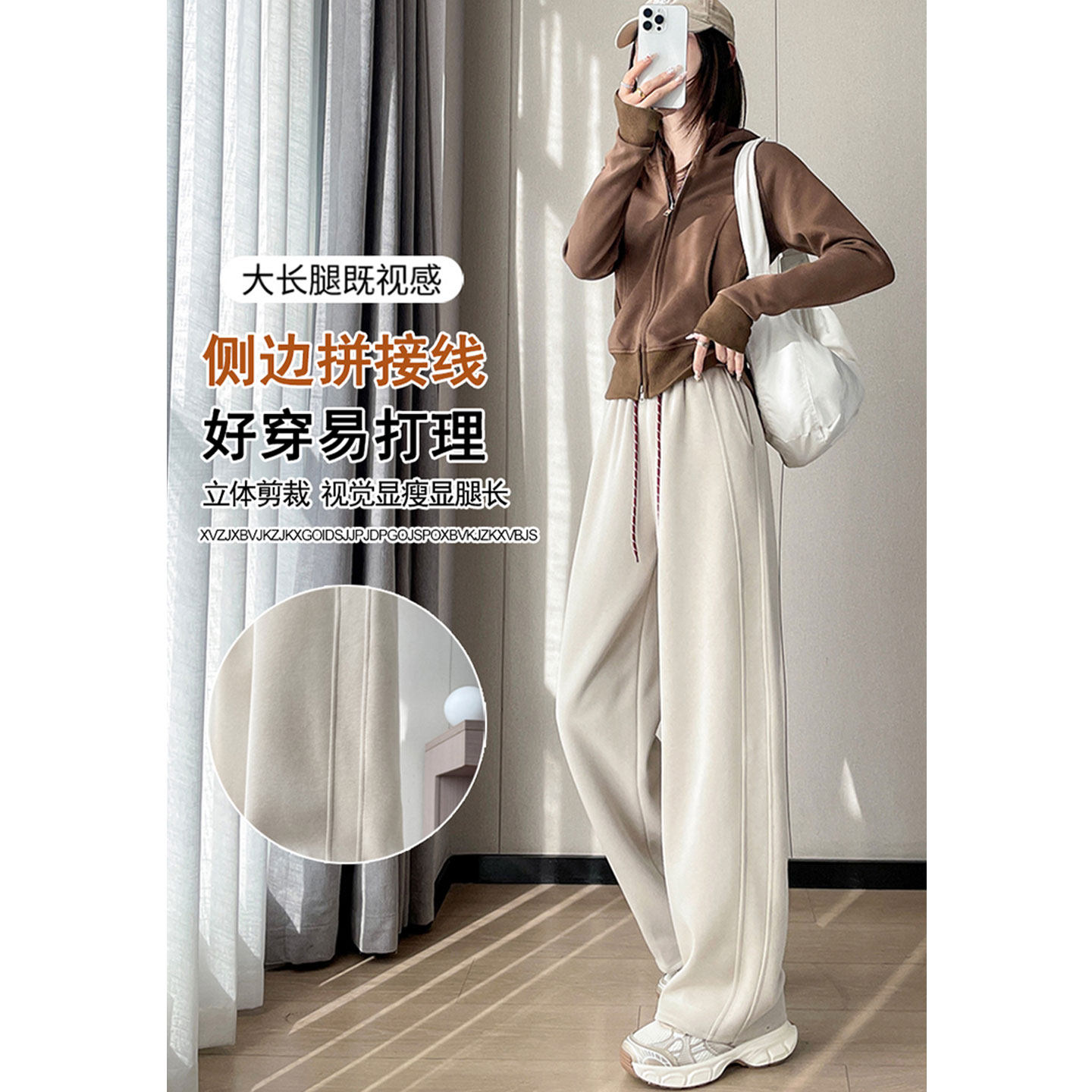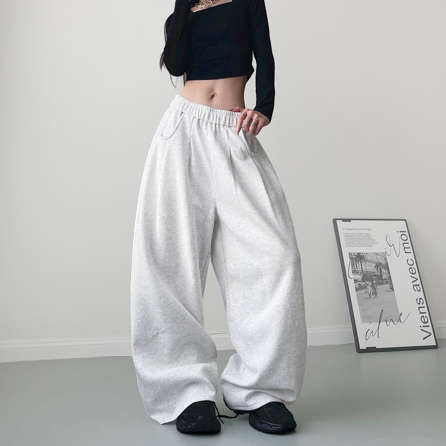 猫猫家加长女裤美式束脚运动裤女春季高腰阔腿灰白色裤子休闲卫裤