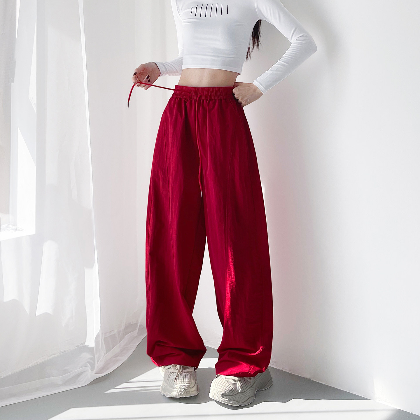 大码肌理感弯刀运动裤女春季新款胖mm显瘦美式工装酷飒红色阔腿裤