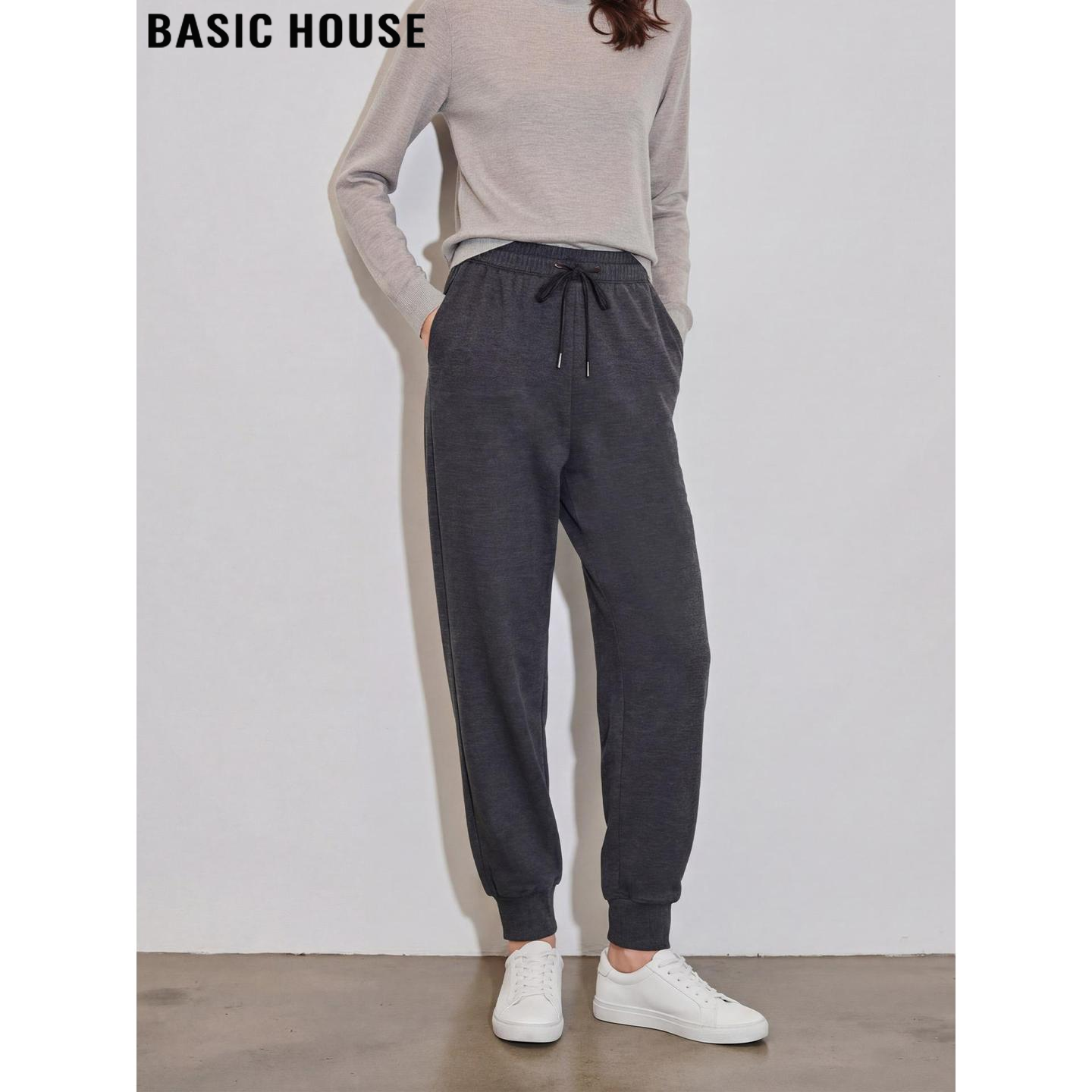 Basic House/百家好灰色束脚运动裤女春季小个子高腰九分哈伦卫裤