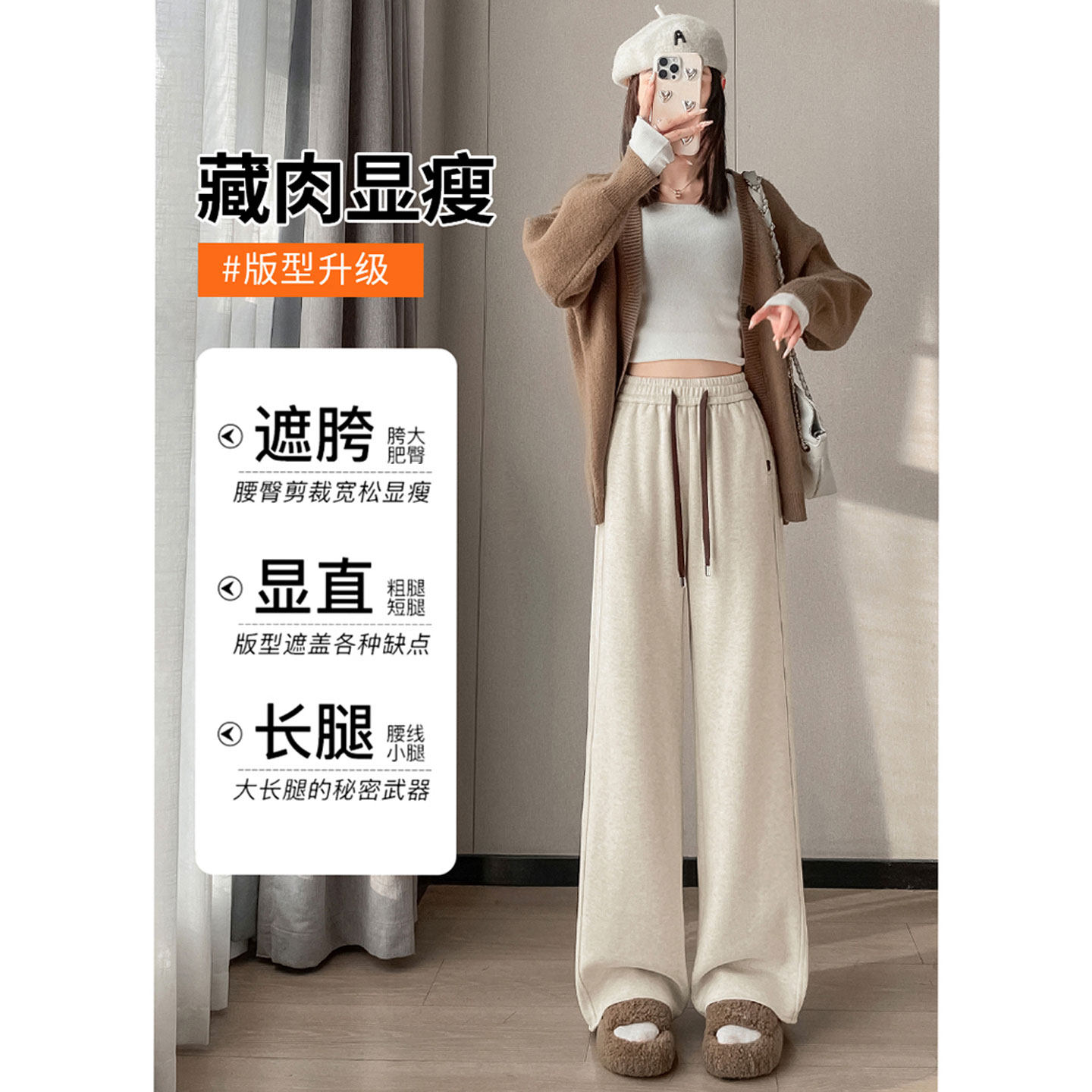 秋冬白色直筒醋酸羊毛休闲运动裤女春季羊绒窄版显瘦阔腿糯米裤子