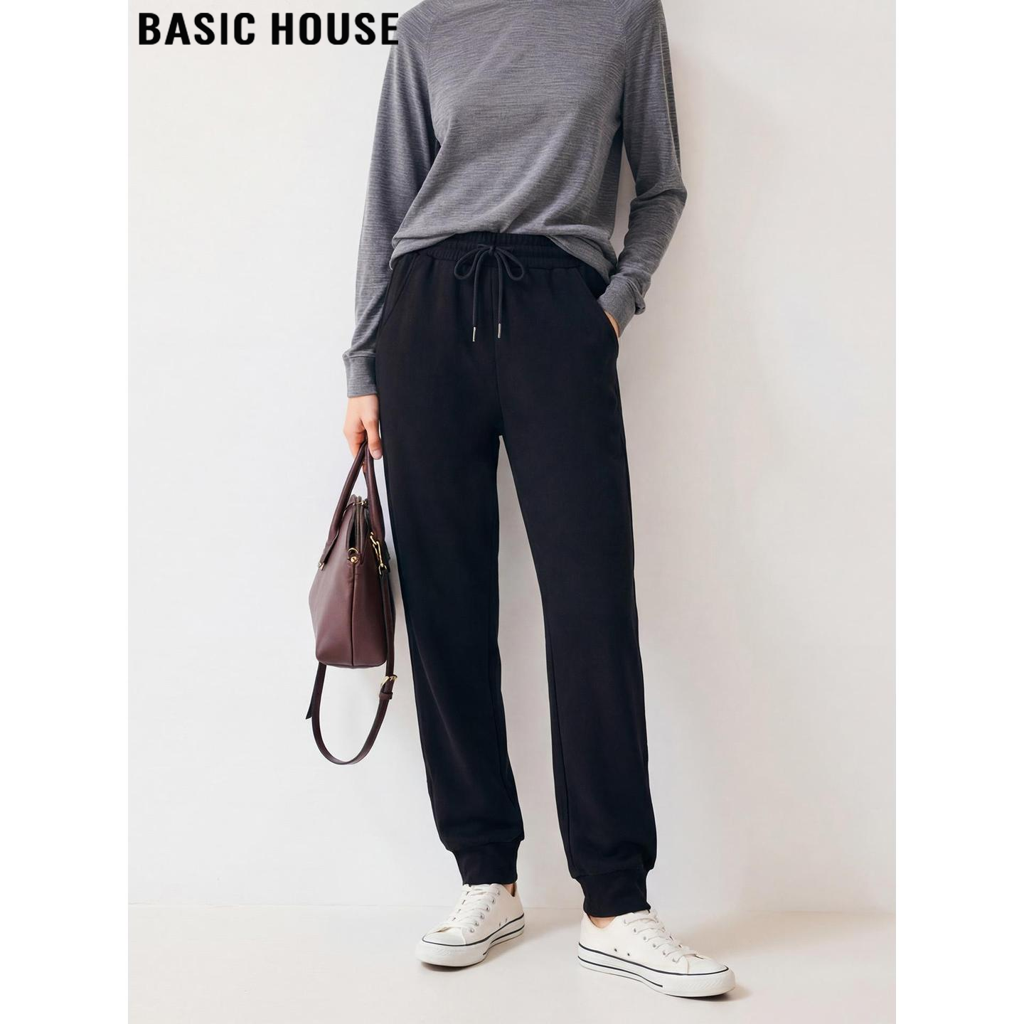 Basic House/百家好黑色束脚运动裤女春季小个子显高百搭高腰卫裤