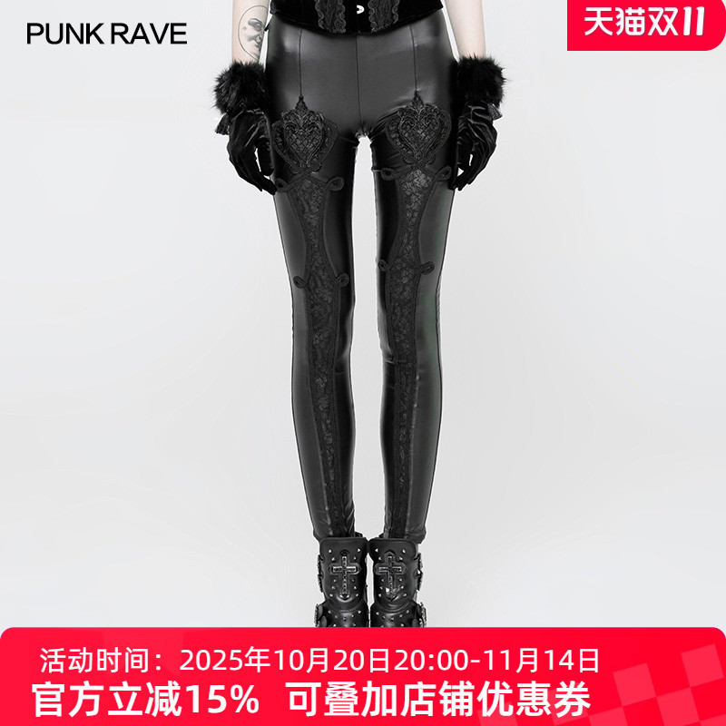 PUNKRAVE女裤哥特式蕾丝装饰紧身皮裤朋克摇滚长裤打底裤小众设计