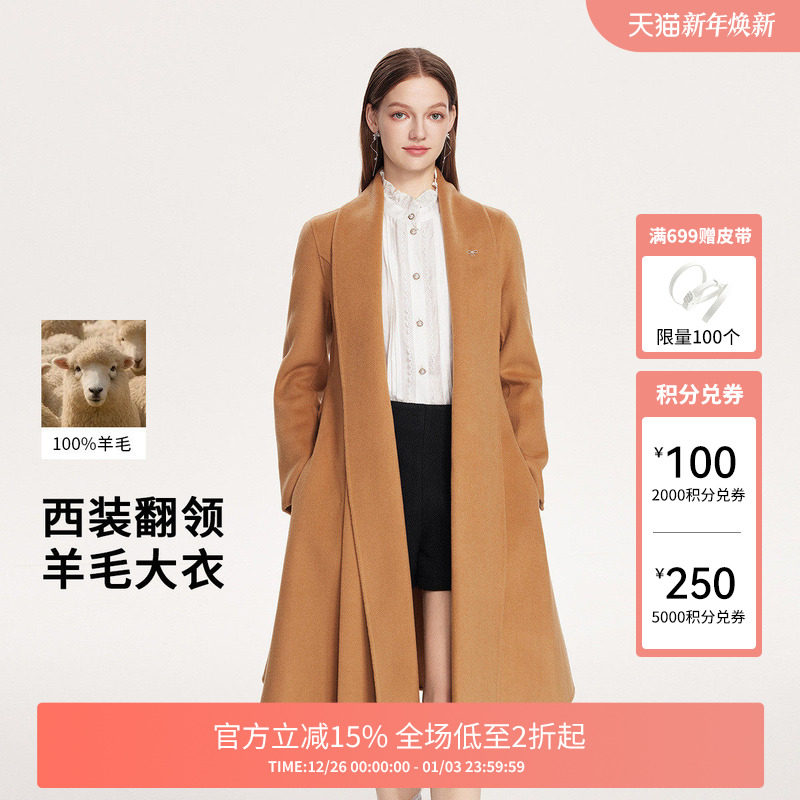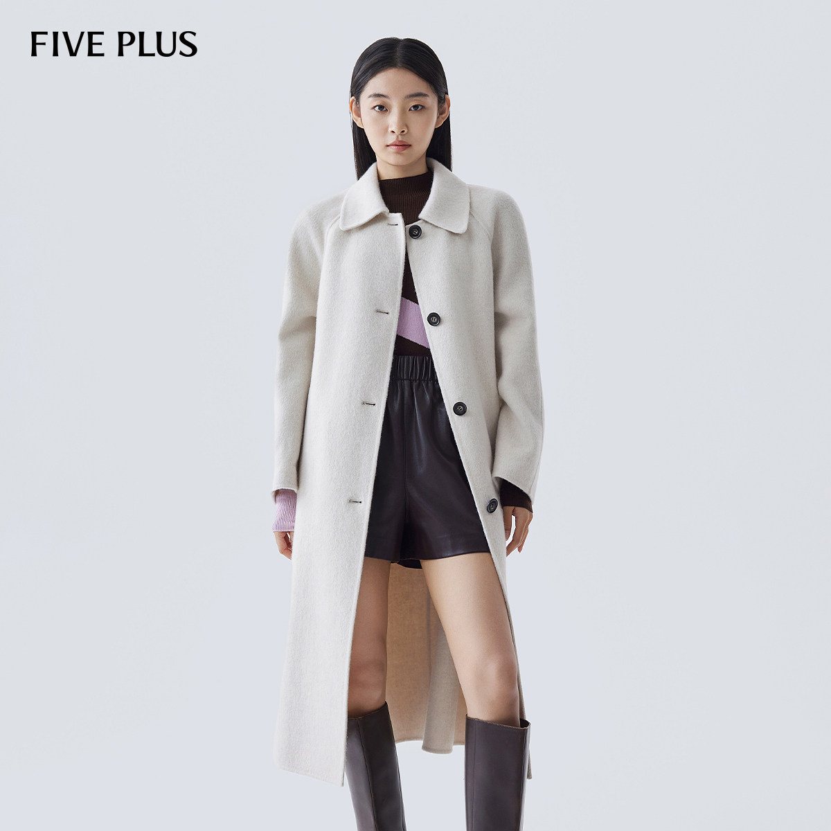 FIVE PLUS双面羊毛大衣女西装领绒外套配腰带毛呢外套女冬中长款