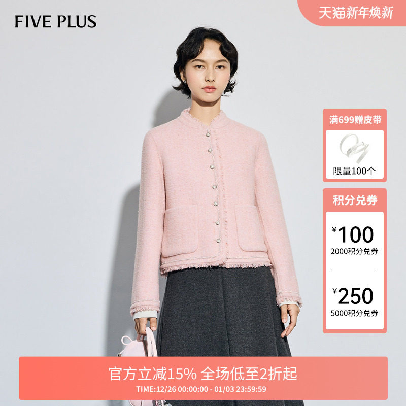 FIVE PLUS呢料甜美风仿珍珠扣毛边出游毛呢短外套2025新款女秋装