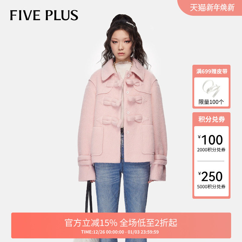 FIVE PLUS呢料法式甜系骆驼绒羊毛蝴蝶结小个子毛呢短外套2025新