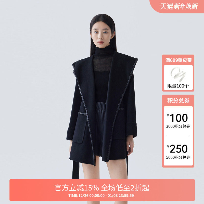 FIVE PLUS羊毛双面呢大衣连帽羊驼毛呢料外套通勤高级感毛呢外套
