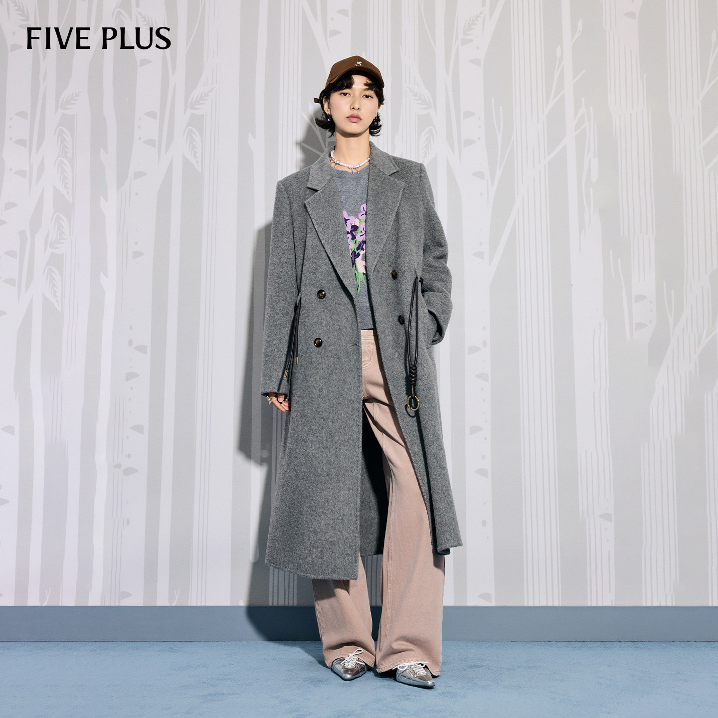FIVE PLUS毛呢外套灰质感简约编织腰带羊毛双面呢大衣25新款冬装