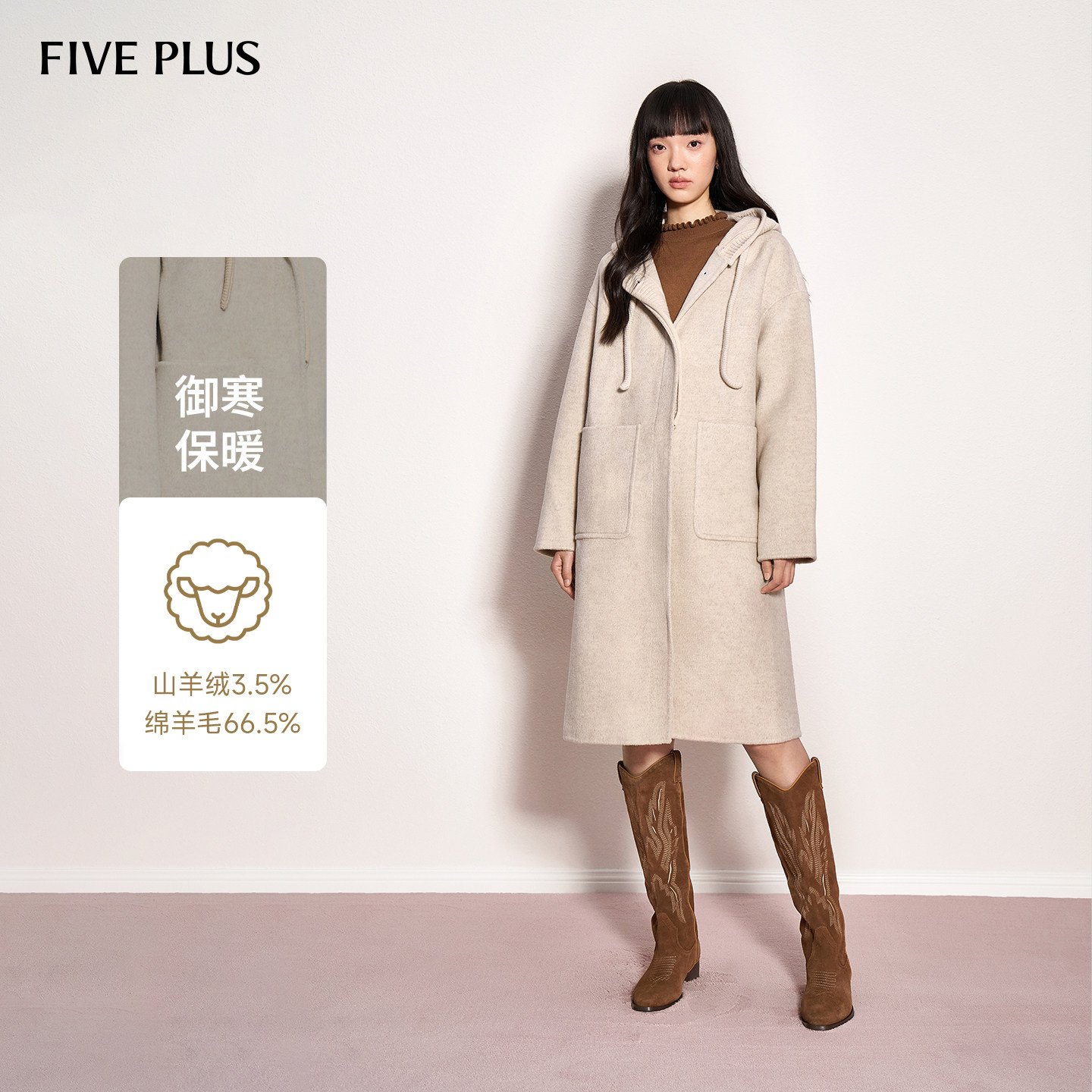 FIVE PLUS双面呢连帽抽绳直筒羊毛混纺中长款大衣2025新毛呢外套