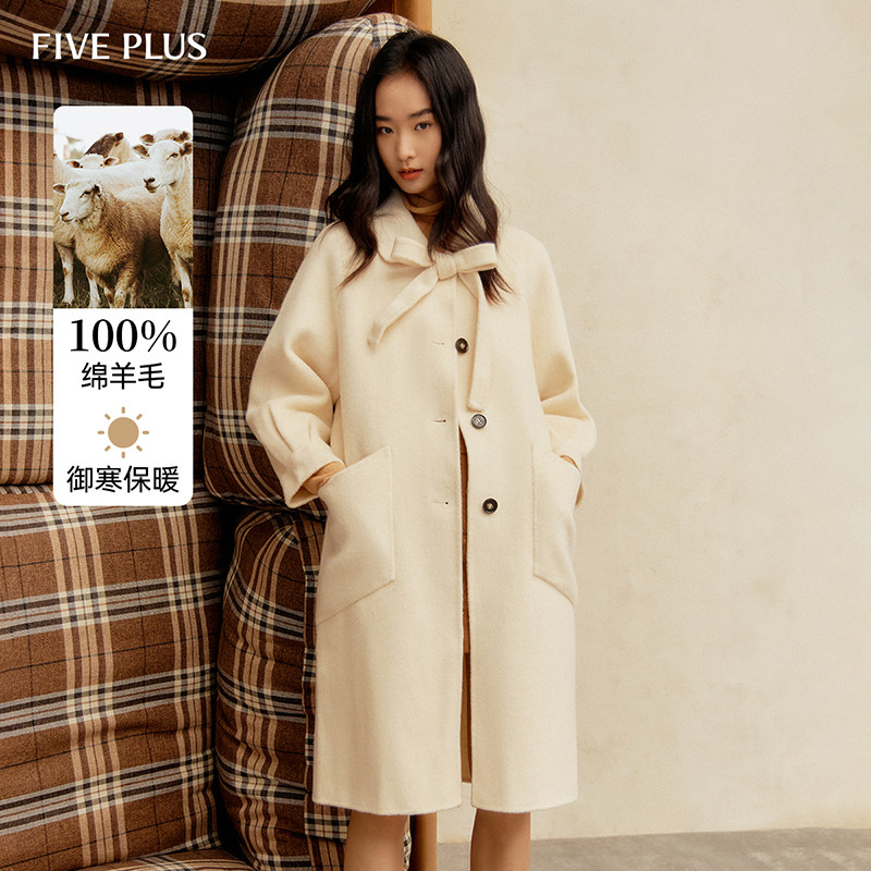 FIVE PLUS双面呢韩系海军领绑带高级感羊毛大衣25新毛呢外套女冬