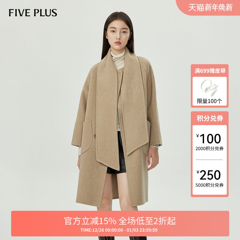 FIVE PLUS羊毛呢大衣女双面呢外套轻暖长款配围巾新款女冬装