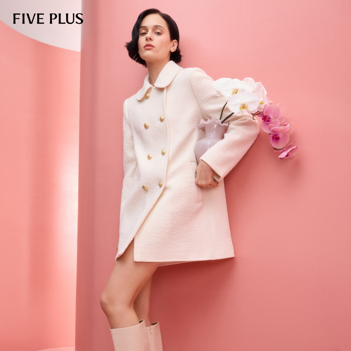 FIVE PLUS呢料羊毛宽松百搭仿珍珠双排扣毛呢外套2025新款女冬装