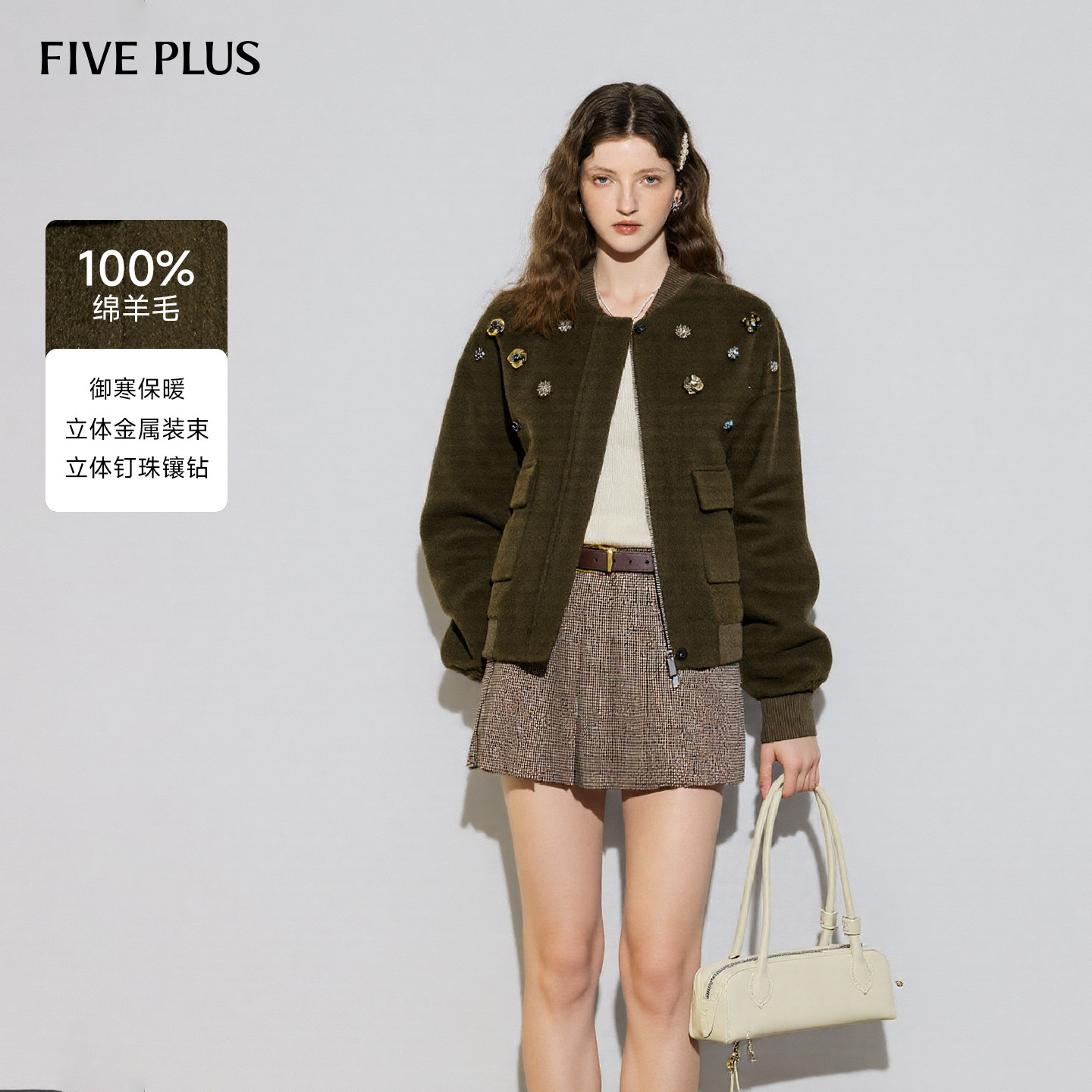FIVE PLUS宽松直筒钉珠镶钻锁暖羊毛呢料高级感复古外套25女冬装