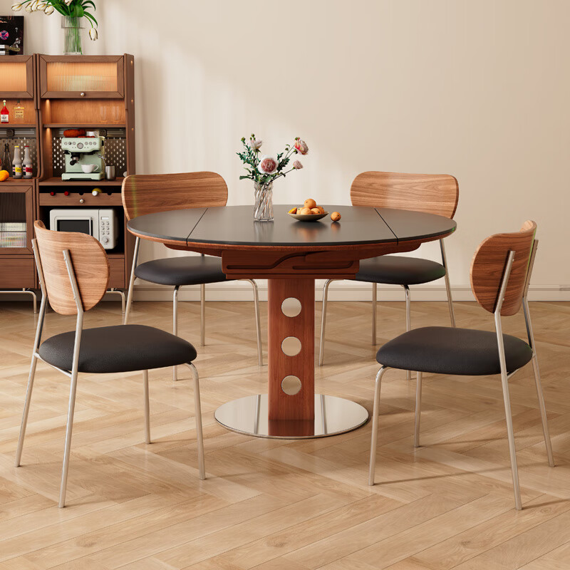 中古风可伸缩折叠包豪斯餐桌实木黑色岩板圆桌家用小户型轻奢餐台