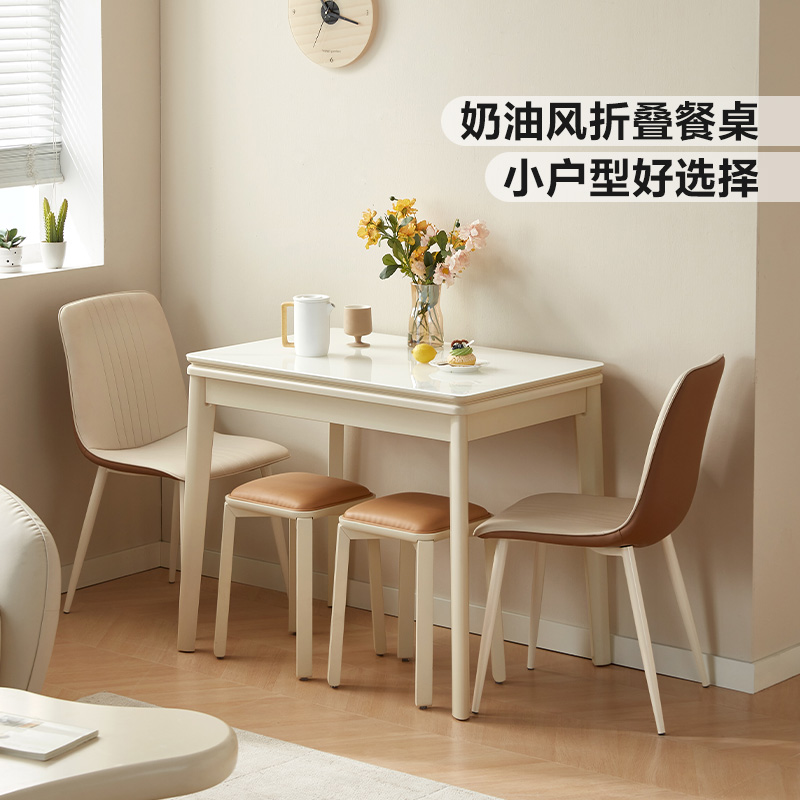 纯白色电磁炉餐桌实木岩板折叠小户型家用伸缩奶油风法式轻奢饭桌