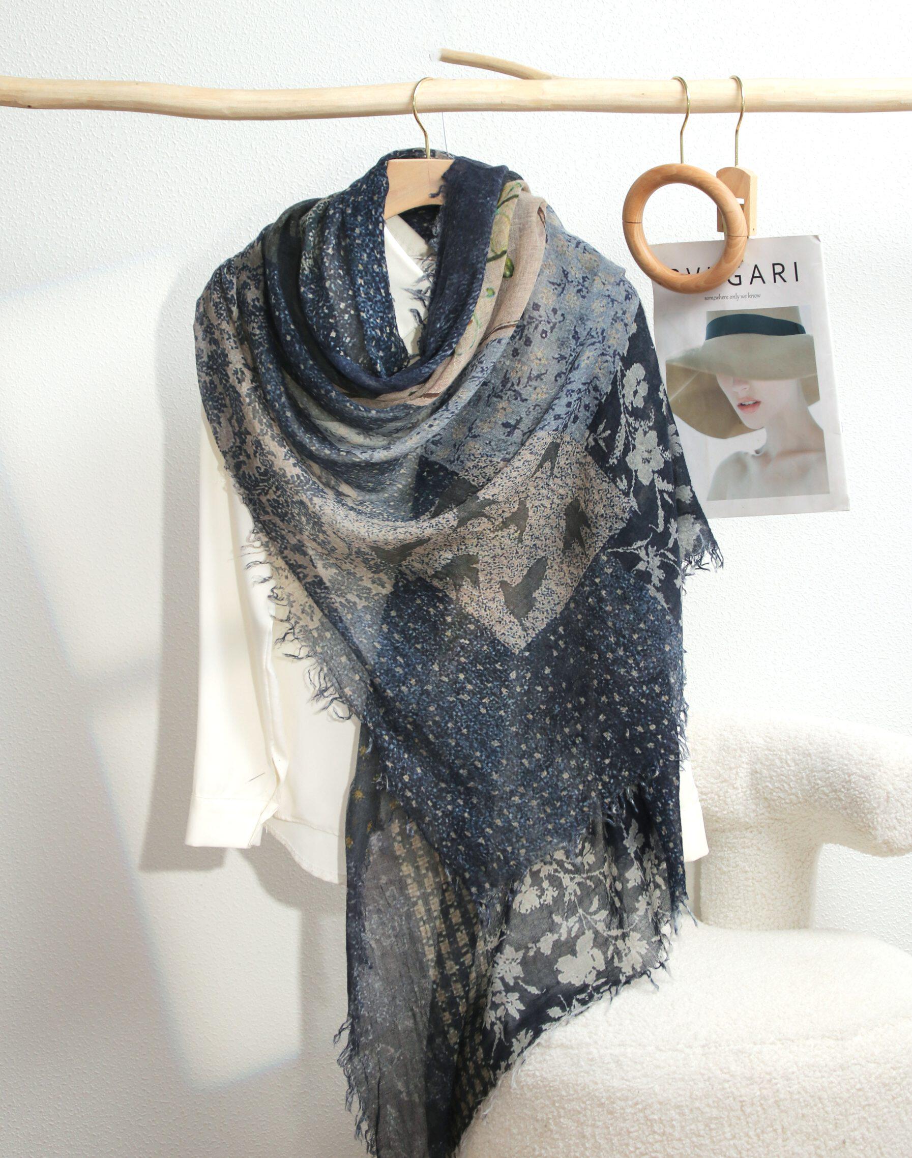 2025春新款女保暖围巾云朵喷绘印花超大防晒旅行拍照羊毛薄款披肩