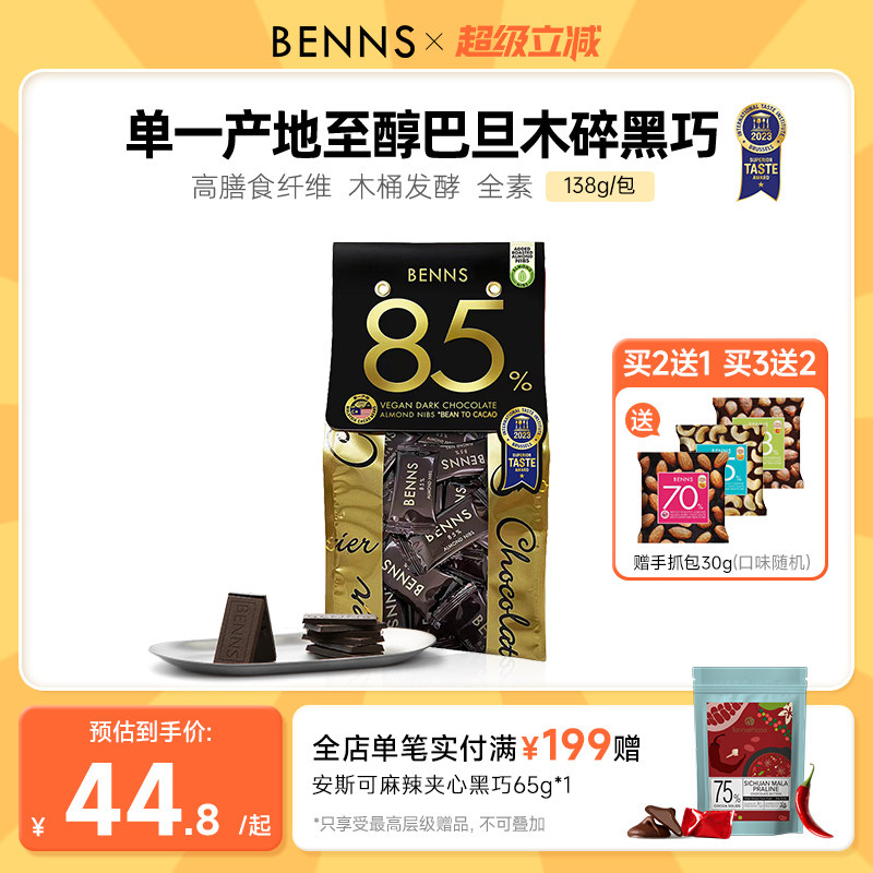 BENNS贝纳丝85%黑巧克力坚果巧克力巴旦木黑巧休闲零食138g*3包