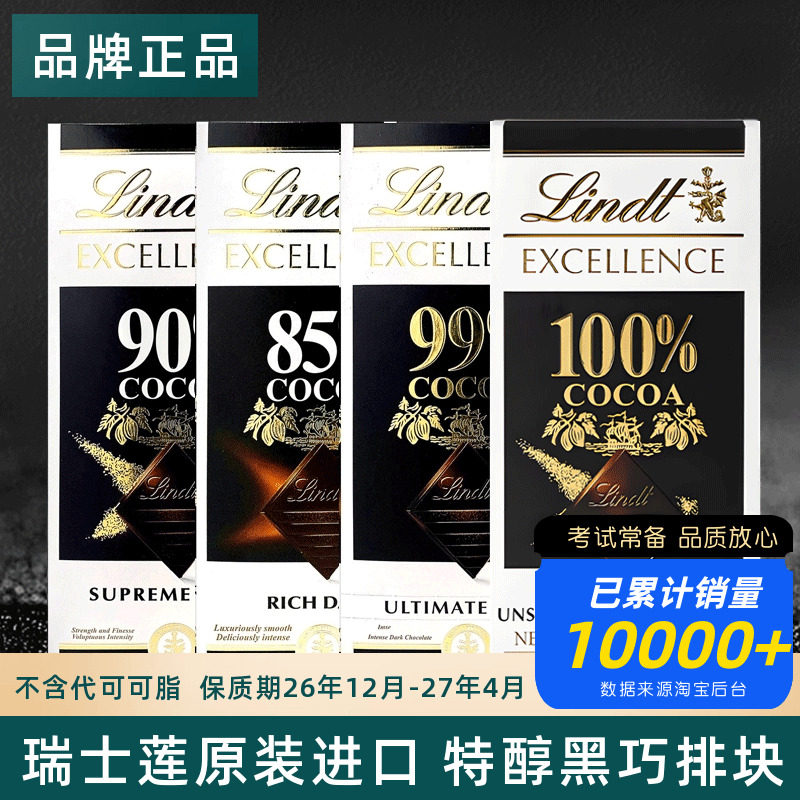 进口Lindt瑞士莲纯黑巧克力特醇排块85%90%99%100%零食送礼黑巧