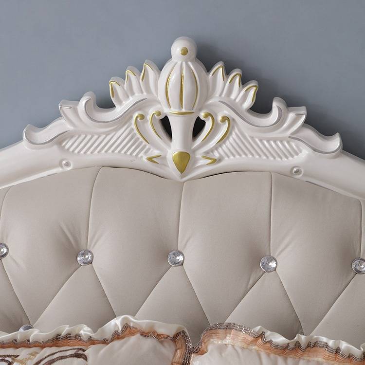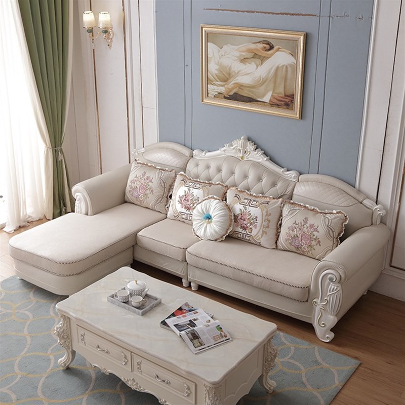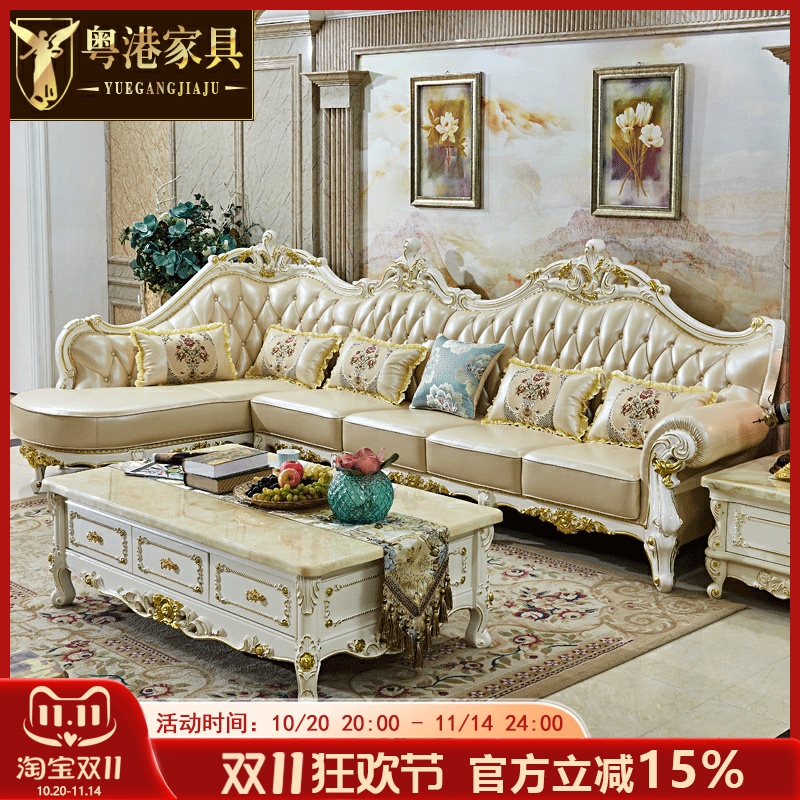欧式真皮转角沙发组合美式珍珠白描金实木雕花头层牛皮大户型沙发