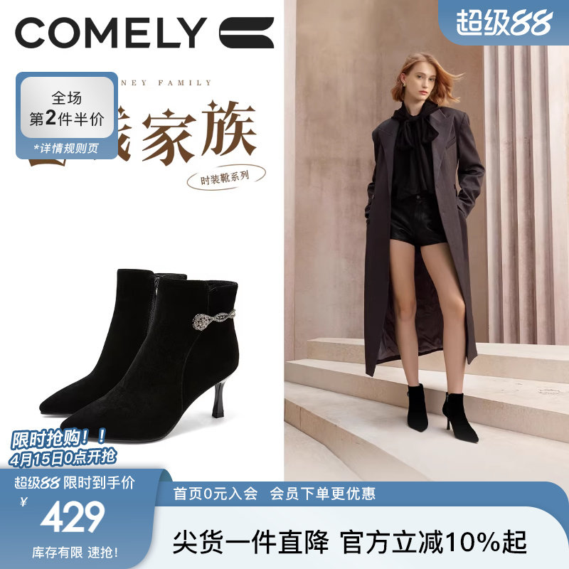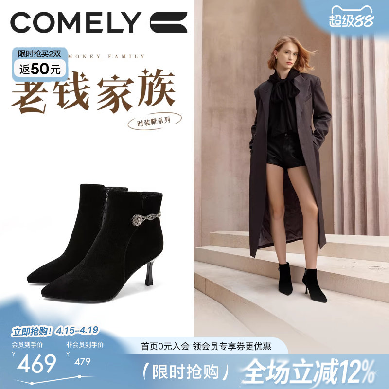 戈美其商场同款冬季新款加绒女靴细高跟短靴粗跟时装百搭拉链棉鞋