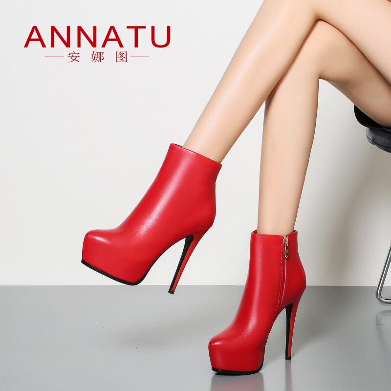 【售完不补】秋冬季细跟真皮女靴子超高跟鞋防水台短靴拉链马丁靴