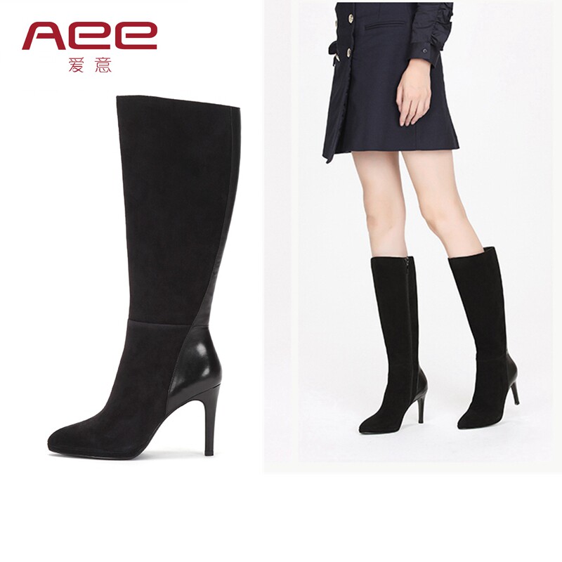 Aee/爱意女靴牛皮拼接羊皮靴子拉链细高跟高筒靴女长靴1617505021