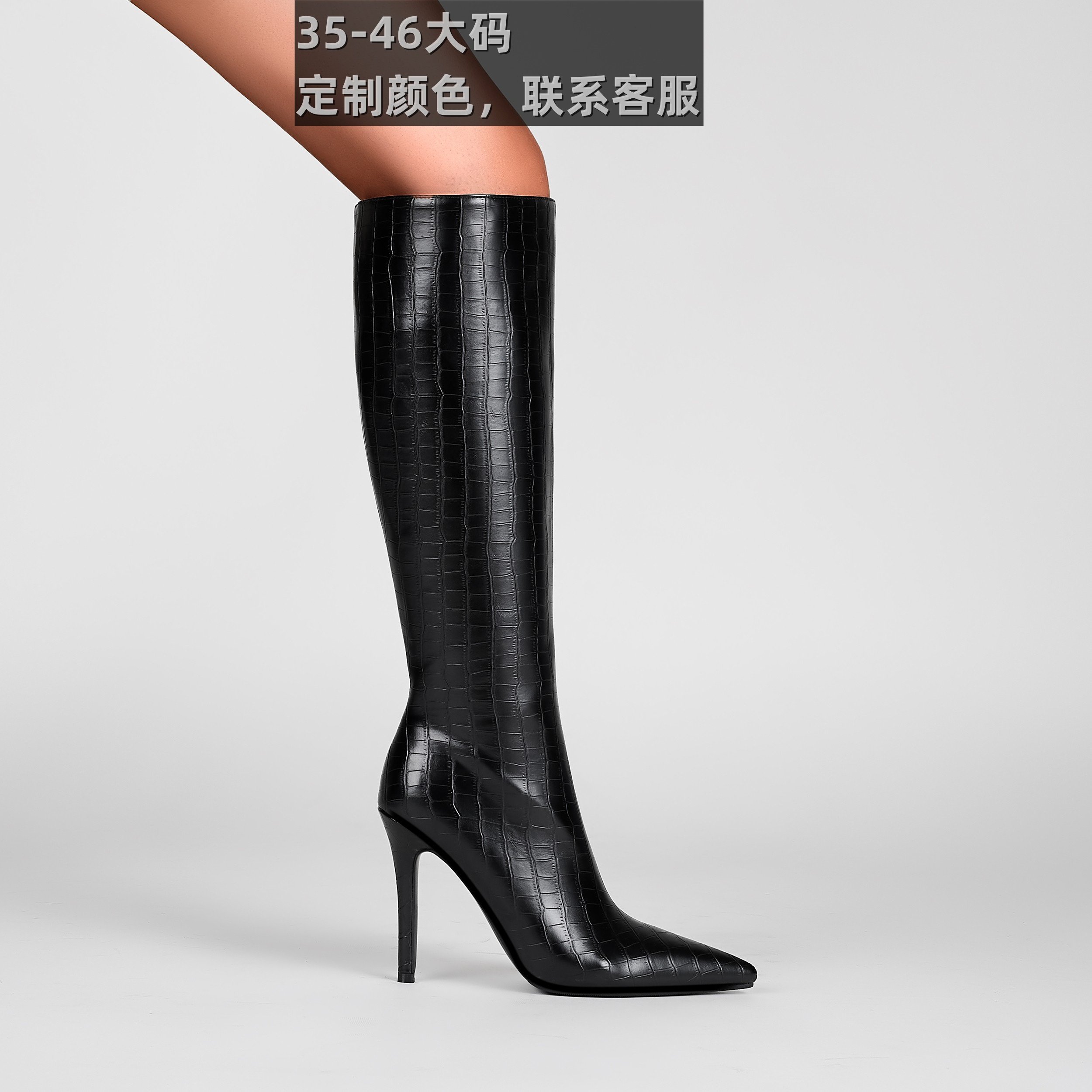 欧美外贸性细高跟蛇纹及膝靴尖头46显瘦大码骑士靴石头纹高筒女靴