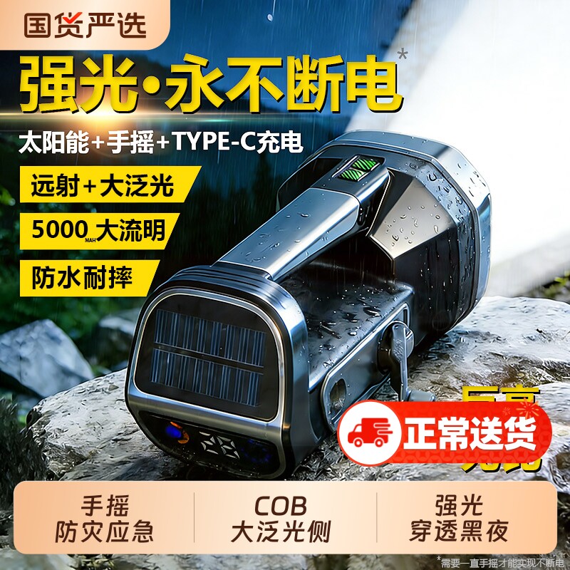 太阳能手电筒强光充电超亮户外长续航手提探照灯远射家用应急防灾