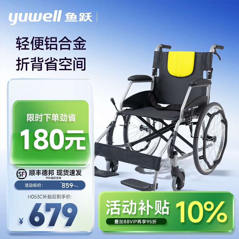 鱼跃铝合金轮椅车折叠轻便老年人大体重胖专用代步手动推车H065C