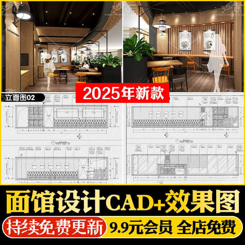 面馆牛肉拉面店铺装修设计CAD施工图纸全套商铺门头室内效果图