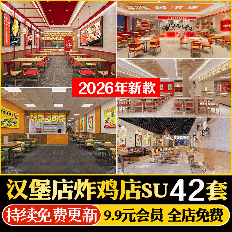 西式快餐汉堡炸鸡店小吃店店铺装修设计草图大师SU模型cad施工图