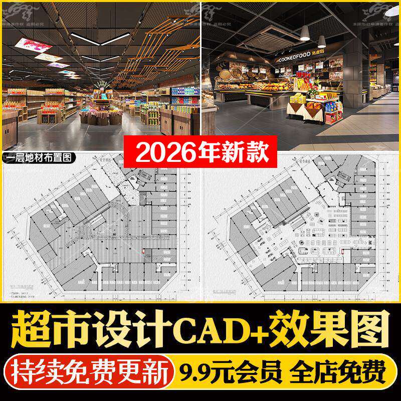 超市商场连锁生鲜店铺装修设计全套CAD施工图纸便利店室内效果图