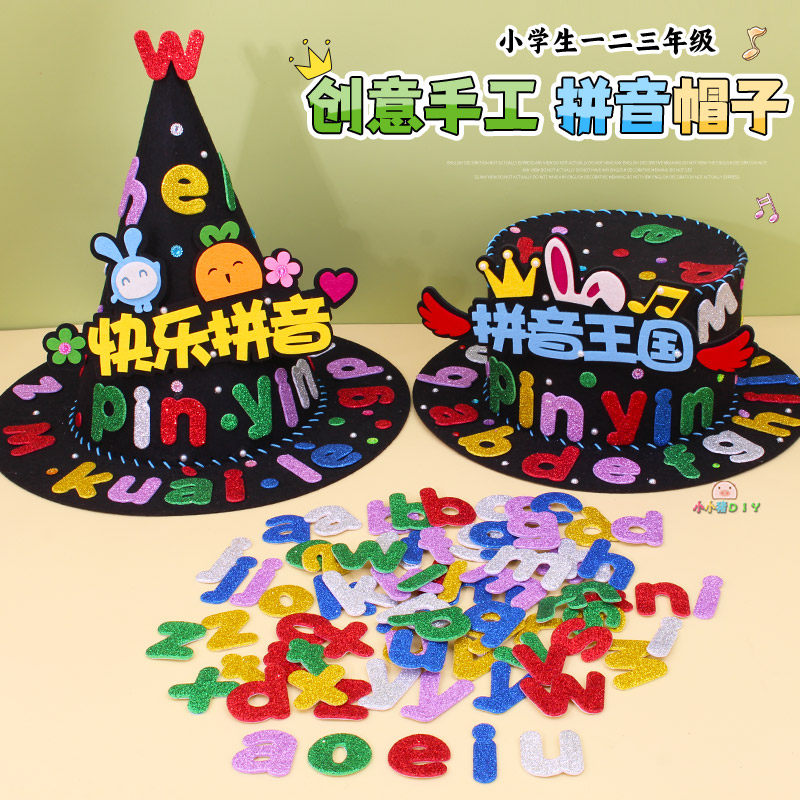 小学生拼音闯关帽子数学元素手工diy儿童英文字母头饰魔法帽制作