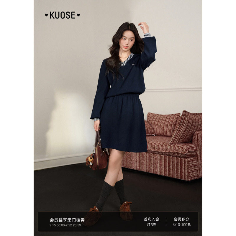 阔色藏蓝色长袖v领学院风连衣裙25秋冬季新款女收腰短裙子毛衣裙