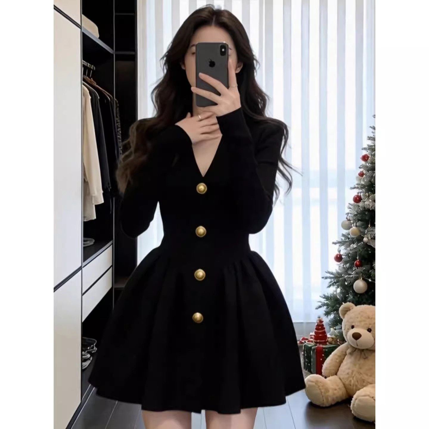JESSIE小香风V领修身连衣裙女25年冬季新款收腰显瘦长袖短款A字裙