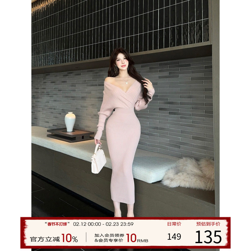 气场王~性感纯欲辣妹V领针织连衣裙女秋冬法式收腰短裙长袖包臀裙