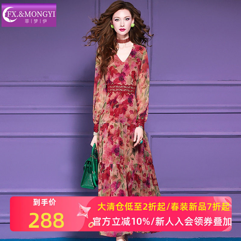 菲梦伊印花连衣裙女长袖秋装轻熟优雅气质女人味收腰V领打底裙子
