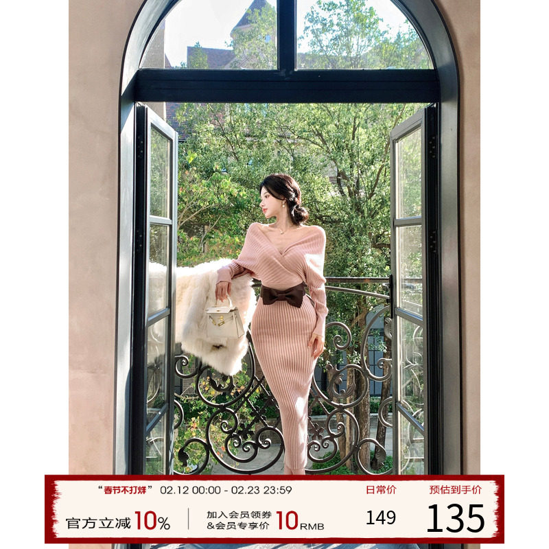 灰尘邓邓 V领针织连衣裙女2025冬季法式收腰长裙包臀裙长袖裙子
