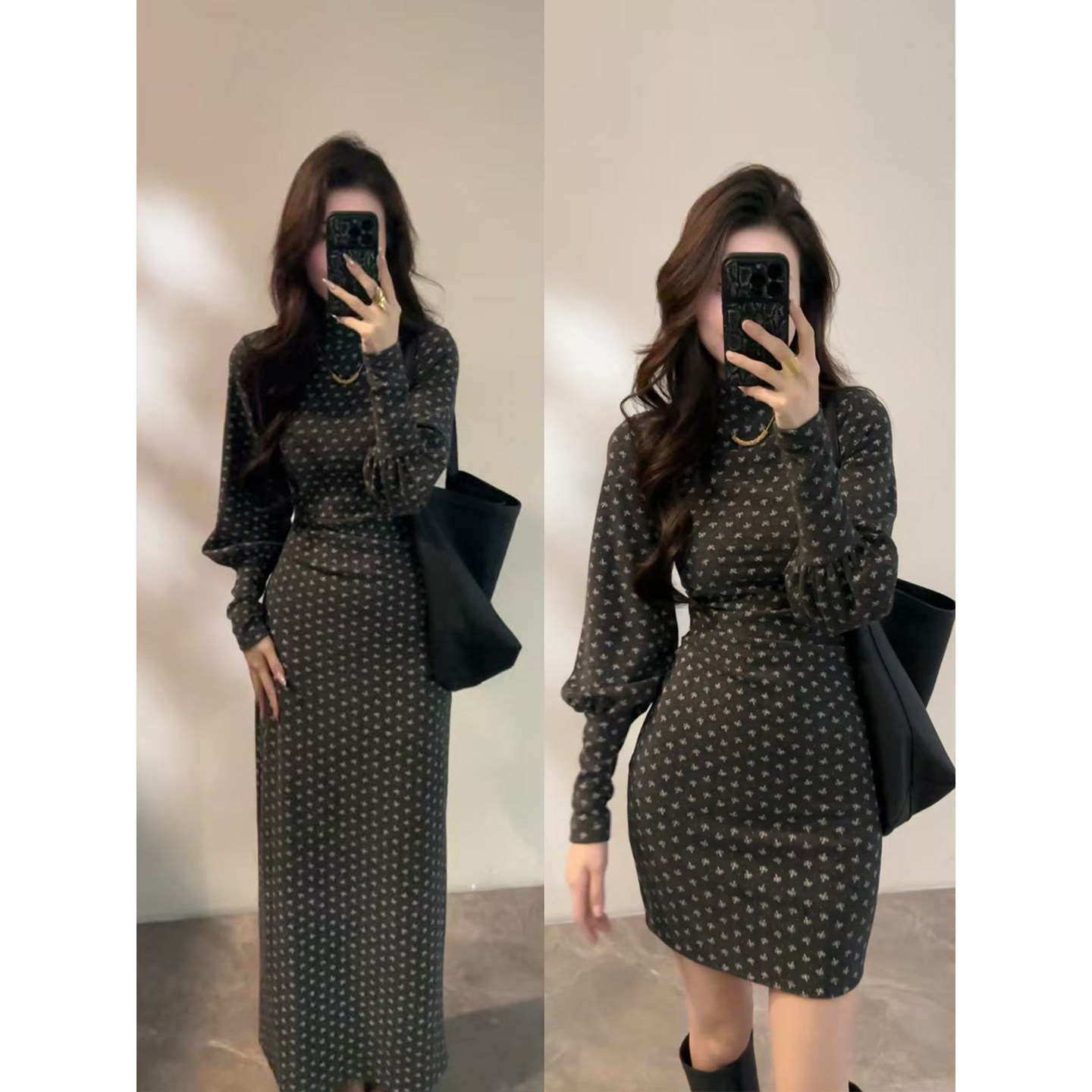大婷婷 显瘦法式秋冬半高领V领收腰长袖裙子灯笼袖连衣裙DT1870