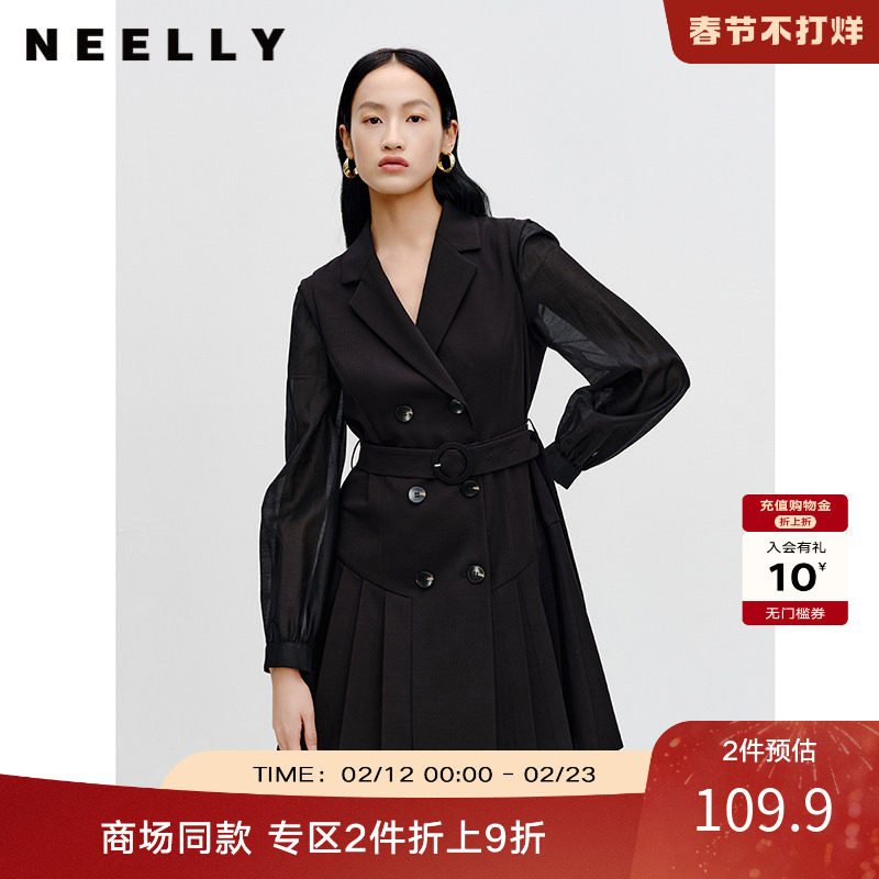 NEELLY纳俪商场同款收腰西装连衣裙早春新款长袖 v领显瘦西装裙女
