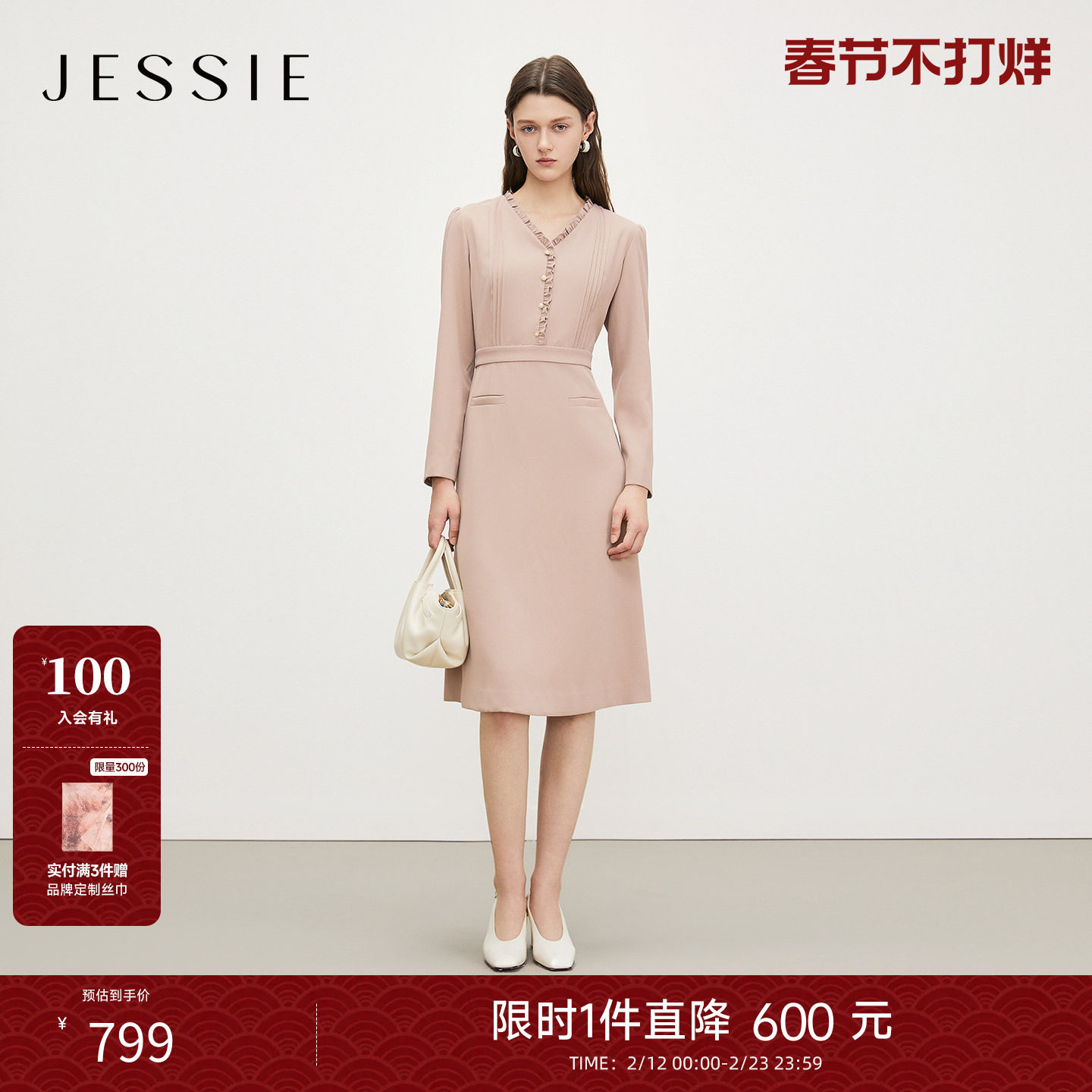 JESSIE优雅荷叶领收腰连衣裙女25年秋冬新款长袖V领压褶修身显瘦